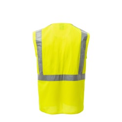 Gilet haute visibilité réalisé en maille respirante dans la partie haute et en tissu dry-tech dans la partie basse, avec bandes rétroréfléchissantes horizontales sur les épaules, la poitrine et la taille, et deux bandes rétroréfléchissantes verticales. Fermeture par zip SBS, avec ruban bicolore. Porte-badge fixe sur la poitrine côté gauche lorsque le vêtement est porté. Passant multifonction, une poche avec porte-stylos fermée par velcro et anneau sur la poitrine côté droit lorsque le vêtement est porté. Deux poches extérieures à soufflet fermées par velcro dans la partie haute et ouverture latérale.