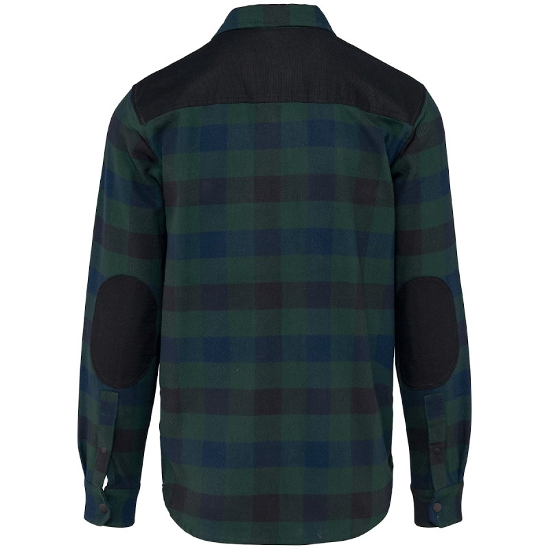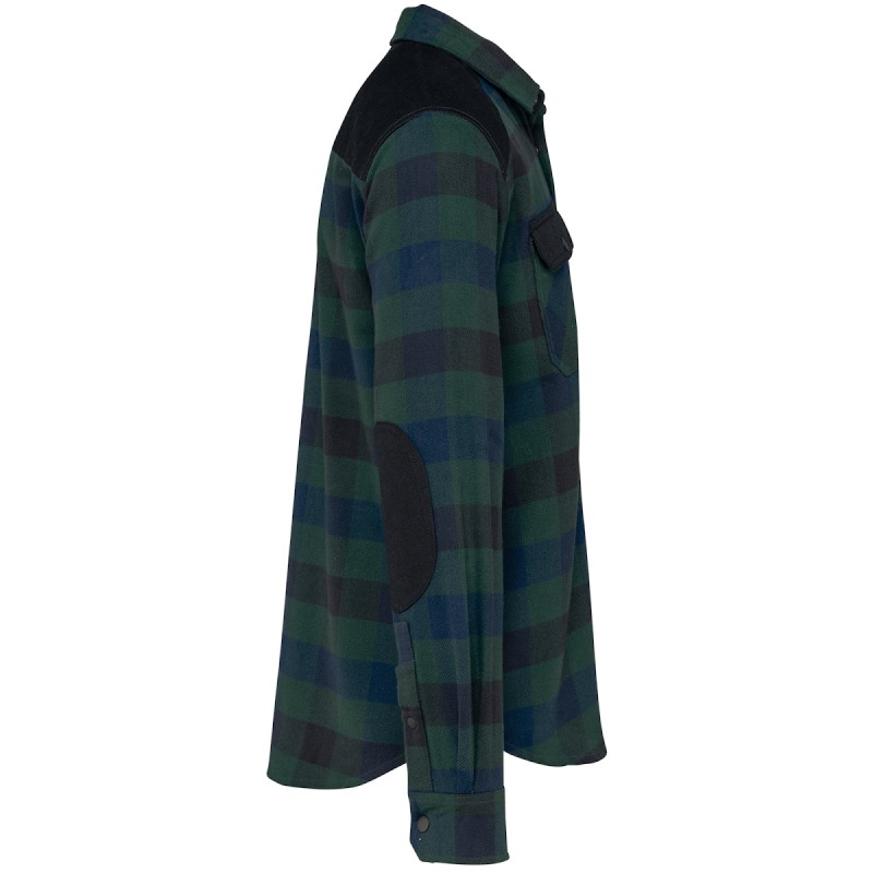 100% coton. Tissu sergé. Coupe Regular. 2 poches poitrine avec rabat contrasté et fermées par boutons pression métal de couleur noire. Fermeture devant et bas de manches par boutons pression métal de couleur noire. Empiècements épaules et coudes de couleur noire pour tous les coloris. Bas de vêtement arrondi. Lien d'accrochage intérieur col en chevron. Etiquette de marque détachable.
