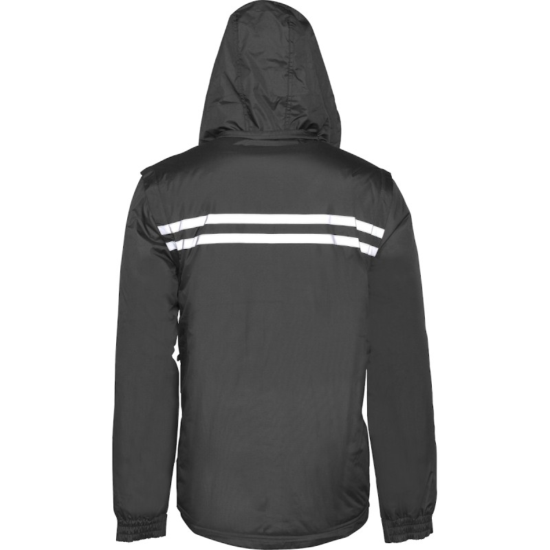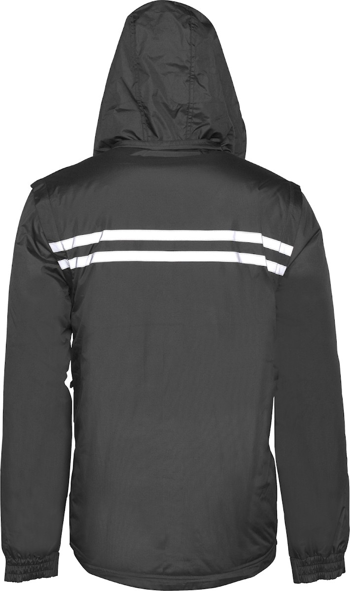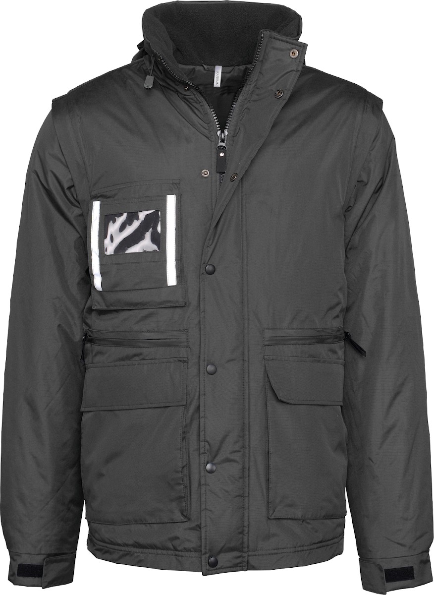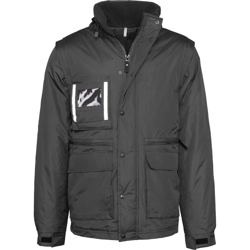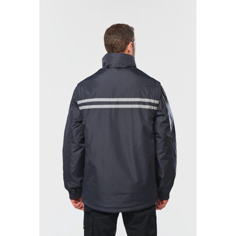 100% polyester. Extérieur : 100% polyester ripstop. Enduction PVC. Intérieur : entièrement ouatiné, doublure dos et intérieur col en polaire. Fermeture zippée et patte de boutonnage pression. Manches amovibles. 5 poches fonctionnelles devant dont une à badge transparente. 1 poche intérieure. Bandes réfléchissantes dos et sur poche poitrine. Bandes de renfort épaules. Ouverture d'aisance zippée au bas de vêtement. Taille ajustable par un cordon intérieur. Capuche dans le col. Zip pour personnalisation bas et poitrine.