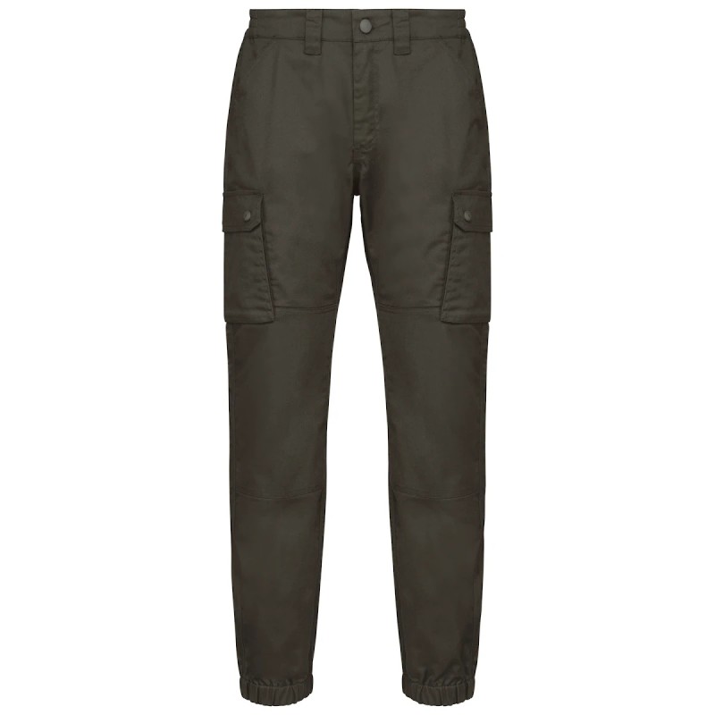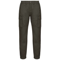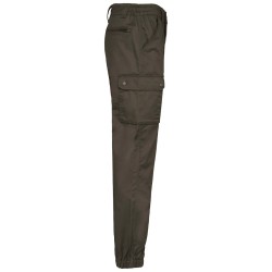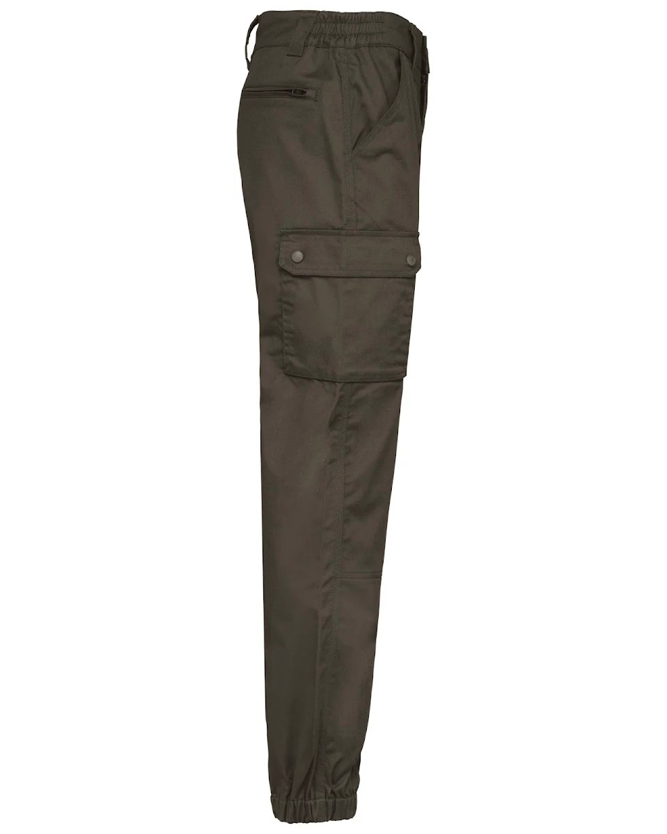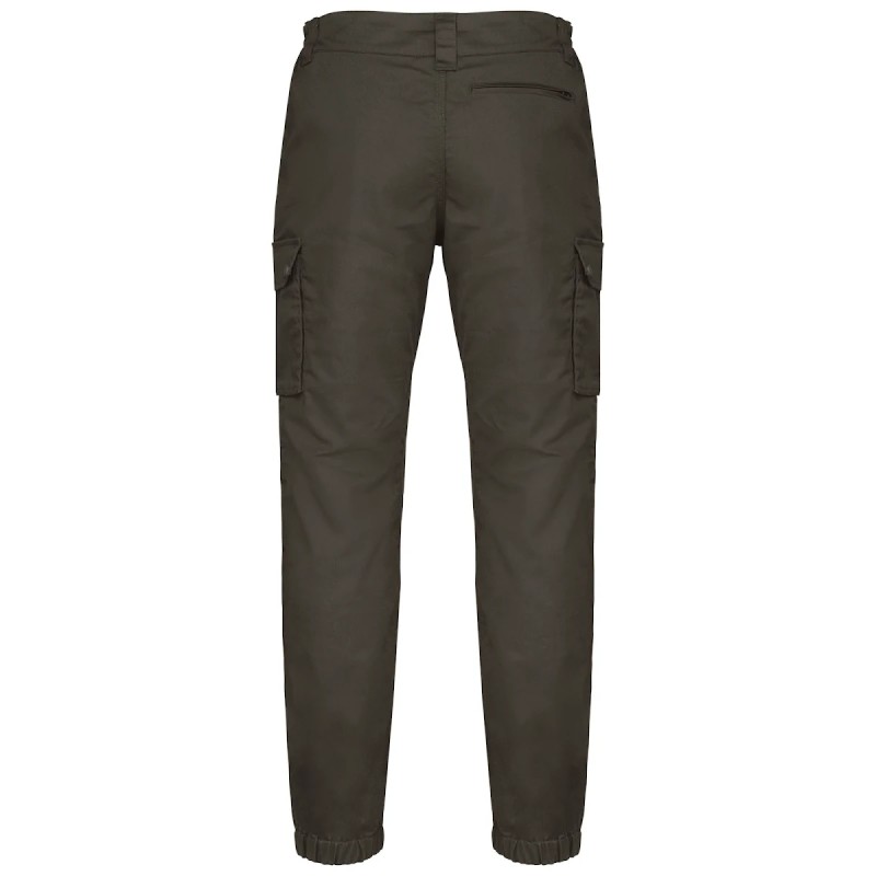 65% polyester / 35% coton. Tissu sergé. Lavage 60°C. Coupe straight. 2 poches devant. 2 poches à soufflet côtés à rabat avec fermeture par boutons pression. 1 poche passepoilée arrière fermée par un zip. Découpes de renfort aux genoux en tissu principal ton sur ton. Ceinture élastiquée côtés avec passants renforcés dont passant milieu dos plus haut (8cm). Fermeture zippée et boutonnée avec bouton plastique. Bas de jambes élastiqué. Triple piqûres à l'entrejambe, côtés et fourche devant et dos pour plus de résistance. Etiquette de marque détachable.