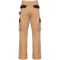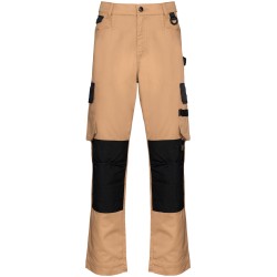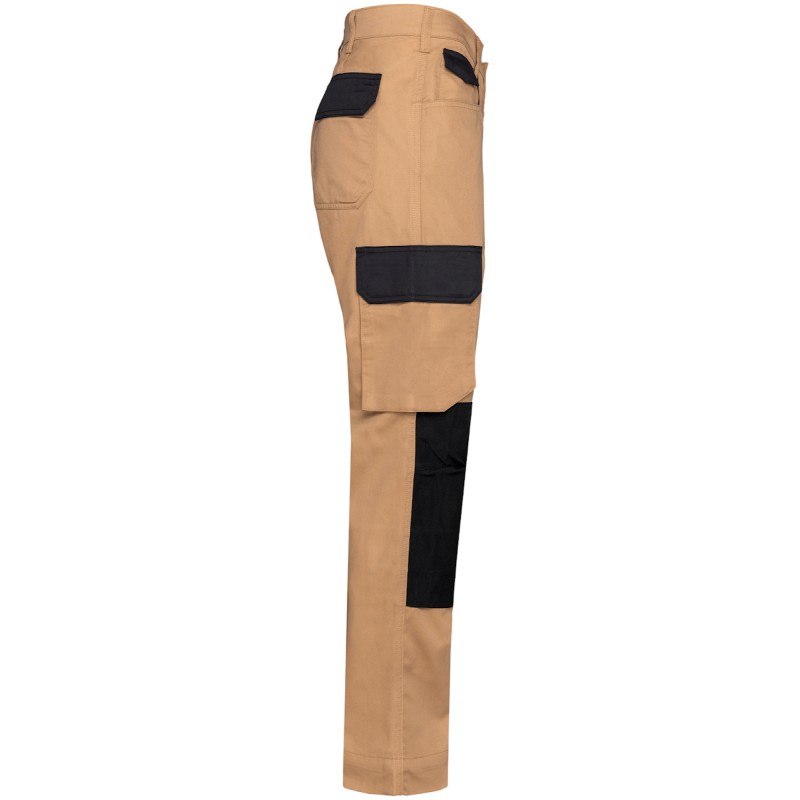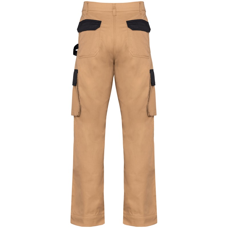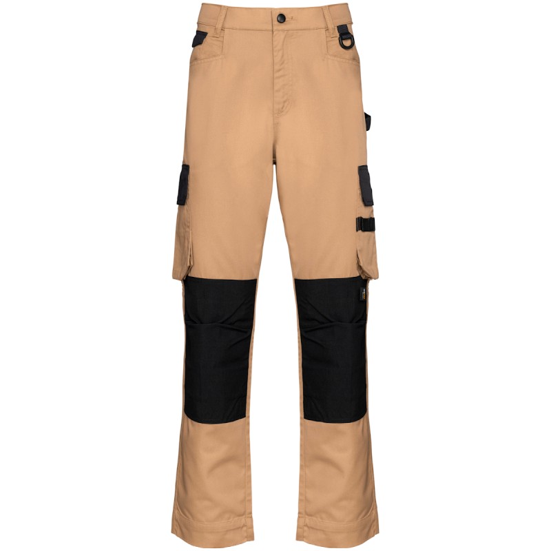 65% polyester / 35% coton. Lavage à 60°C. Coupe droite. 2 poches devant (sacs de poches en tissu principal) dont 1 avec petite poche intérieure fermée avec rabat contrasté (sauf pour coloris noir). 2 poches cargo volantes à soufflet et rabat contrasté (sauf pour coloris noir) avec fermeture velcro dont une à 2 compartiments et emplacements outils. 2 poches arrière avec rabat et fermeture velcro, 1 porte-marteau à gauche au porté. 2 poches genouillères Cordura® contrastées (couleur noire pour toutes les couleurs) avec velcro et rabat intérieur pour maintenir et adapter la genouillère. Ceinture avec passants. Anneau en plastique fixé sur la ceinture à l'avant gauche au porté. Fermeture zippée et boutonnée (bouton métal recouvert de plastique). Double piqûres coutures côtés, triple coutures fourche devant et dos. Genouillère non fournie. Surpiqûres nervures à l'entrejambe. Entrejambe 80 et ourlet de 5 cm. Etiquette de marque détachable.