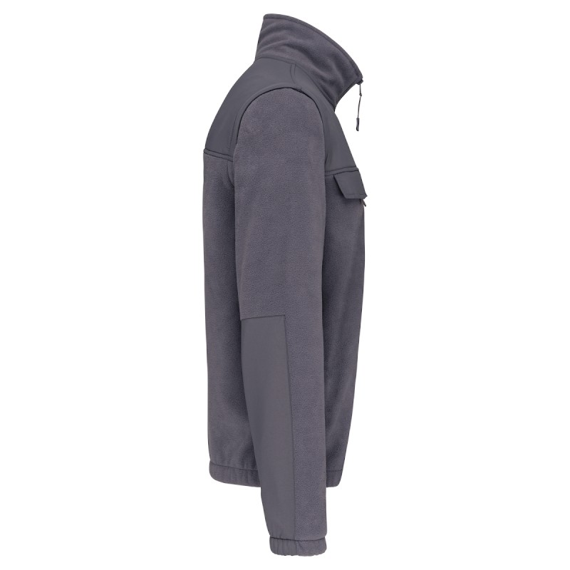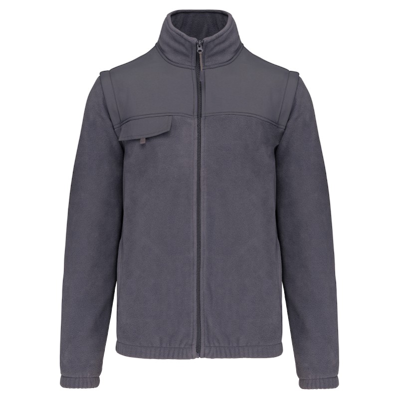 100% polyester. Extérieur : polaire 100% polyester 400 g/m². Renforts 100% polyester taslon avec enduction acrylique. Doublure intérieure manches polyester 210T. Produit 2 en 1. 2 poches avant zippées et 1 poche poitrine avec rabat et bande auto-agrippante. Larges protections ton sur ton aux épaules et avant-bras. Personnalisation facilitée avant et dos. Manches amovibles doublées polyester pour plus de confort. Poignets et bas de vêtement élastiqués.