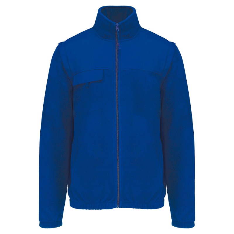 100% polyester. Extérieur : polaire 100% polyester 400 g/m². Renforts 100% polyester taslon avec enduction acrylique. Doublure intérieure manches polyester 210T. Produit 2 en 1. 2 poches avant zippées et 1 poche poitrine avec rabat et bande auto-agrippante. Larges protections ton sur ton aux épaules et avant-bras. Personnalisation facilitée avant et dos. Manches amovibles doublées polyester pour plus de confort. Poignets et bas de vêtement élastiqués.