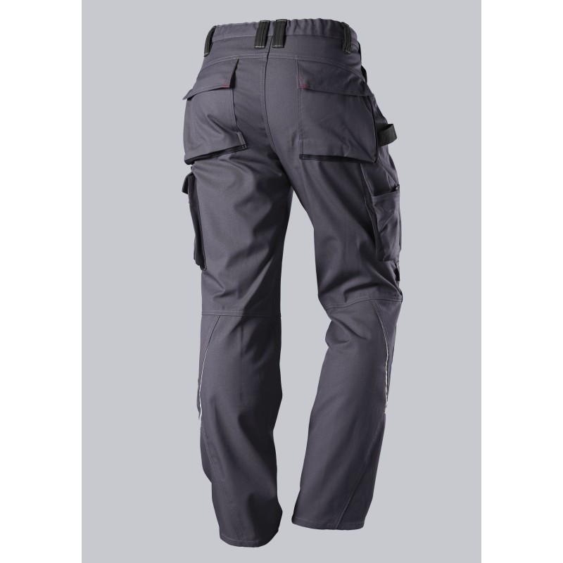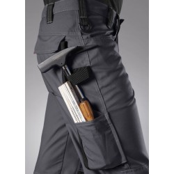 Anneau en D, 2 poches latérales, 2 poches revolver fermées par rabat et bouton-pression, 1 grande poche cuisse avec poche smartphone plaquée, double poche mètre fixée d'un seul côté.