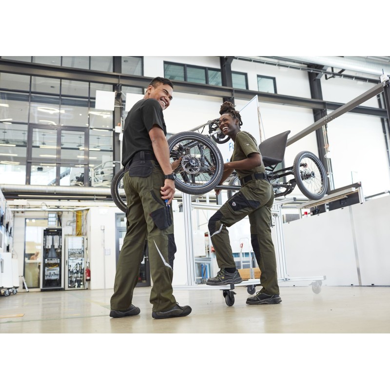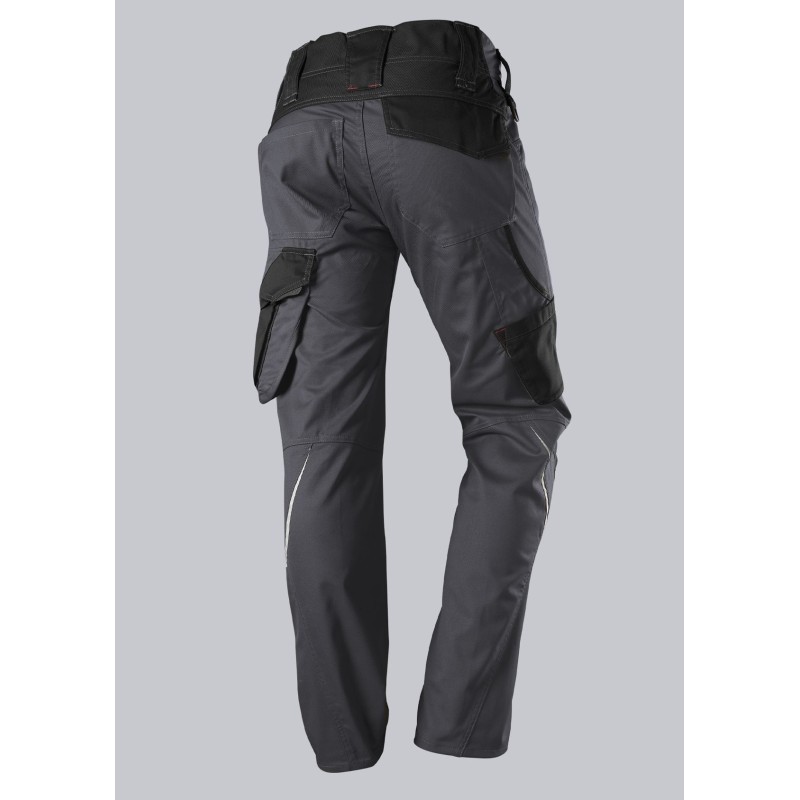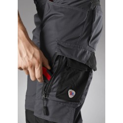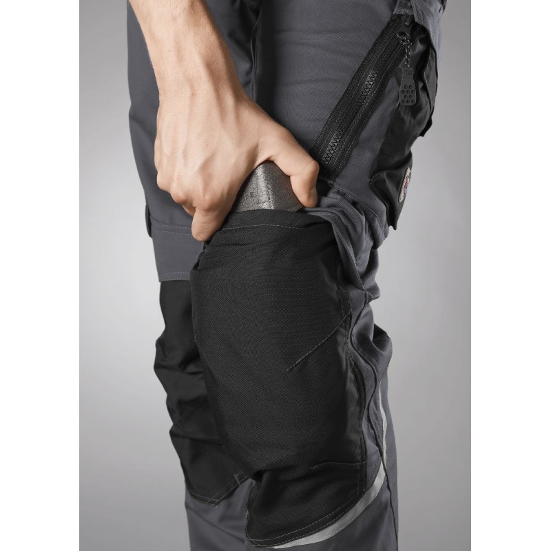 2 poches latérales avec fermeture à glissière, 2 poches revolver, 1 grande poche cuisse avec fermeture à glissière et poche smartphone plaquée, anneau en D pour fixation d’accessoires, double poche mètre fixée d’un seul côté.