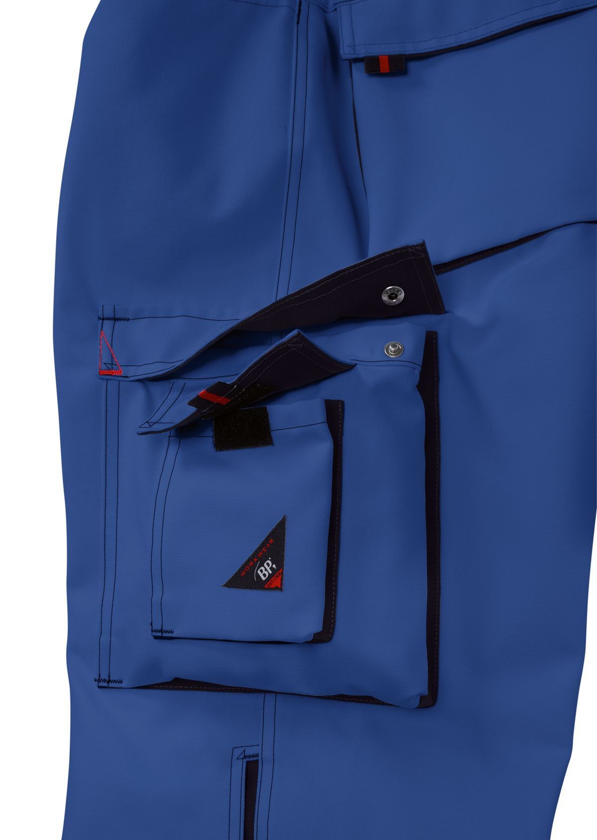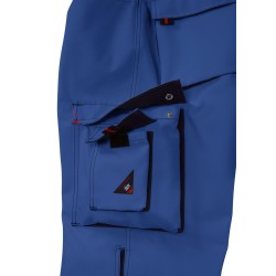 Anneau en D, 2 poches latérales, 2 poches revolver fermées par rabat et bouton-pression, 1 grande poche cuisse avec poche smartphone plaquée, double poche mètre fixée d'un seul côté.