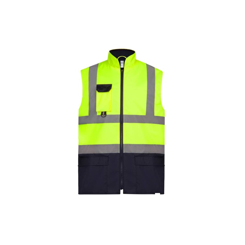 100% polyester. Fabriqué en 3 couches: 1) Extérieur: polyester enduit PU oxford. Imperméable, 2) couche intermédiaire en non-tissé et 3) doublure intérieure en molleton, afin de maximiser la résistance aux intempéries, le confort et la chaleur. L'ourlet bleu marine offre un bon contraste et aide à rester propre. Poche pour téléphone portable à la poitrine avec anneau en D en dessous. Deux poches en bas. Accès à la décoration du logo. Idéal pour le port quotidien au travail. Conforme à la norme EN ISO20471:2013 Catégorie 2.
