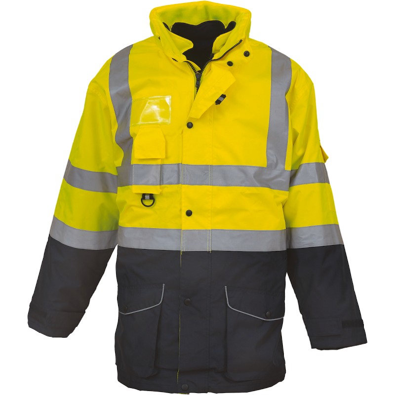 Veste extérieure : polyester Oxford avec revêtement PU 300D. Doublure en maille. Imperméable et respirant. Coutures entièrement cousues et collées pour une étanchéité parfaite. Deux poches réchauffe-mains externes. Capuche détachable dissimulée. Poches pour téléphone portable et papiers d'identité sur la poitrine. Conforme à la norme EN ISO20471:2013 catégorie 3. Egalement conforme à la norme relative aux 'Vêtements de Haute Visibilité' des chemins de fer UK GO/RT 3279 Issue 8:2013 (orange uniquement). Veste intérieure : rattachée à la parka par zip. Manches amovibles. Matelassée. Haute visibilité. Réversible Black. Deux poches de chaque côté.