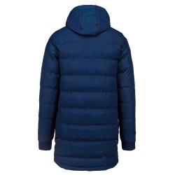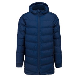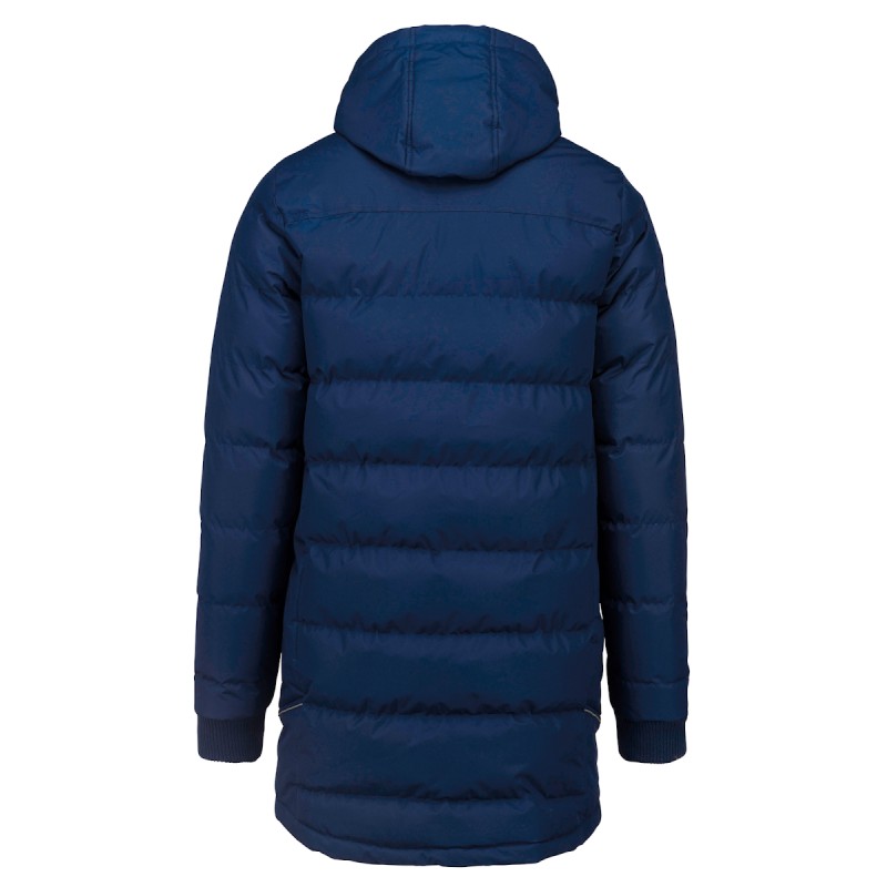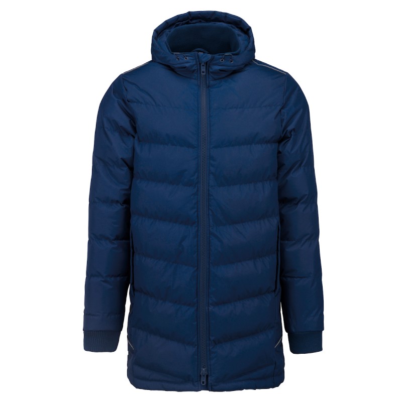 Extérieur : 100% polyester 200 g/m² avec enduction PVC (traitement déperlant). Garniture intérieure 100% polyester 350 g/m². Doublure 100% polyester 60 g/m². 2 poches latérales zippées. 1 poche intérieure. Col et bas de manches en bord-côte. Biais réfléchissants épaules et côtés. Capuche doublée. 1 zip côté cœur et 1 zip au bas du vêtement pour accès personnalisation.