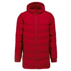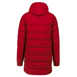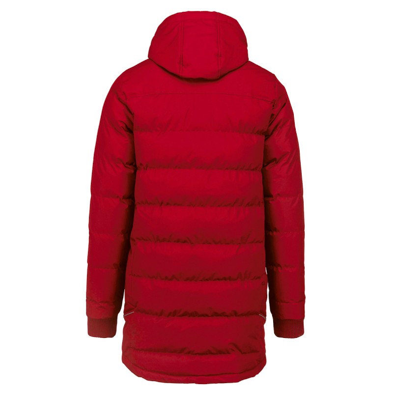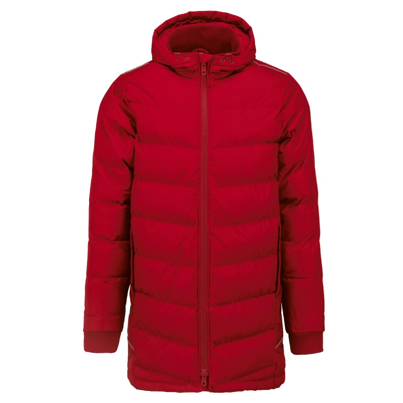 Extérieur : 100% polyester 200 g/m² avec enduction PVC (traitement déperlant). Garniture intérieure 100% polyester 350 g/m². Doublure 100% polyester 60 g/m². 2 poches latérales zippées. 1 poche intérieure. Col et bas de manches en bord-côte.  Biais réfléchissants épaules et côtés. Capuche doublée. 1 zip côté cœur et 1 zip au bas du vêtement pour accès personnalisation.