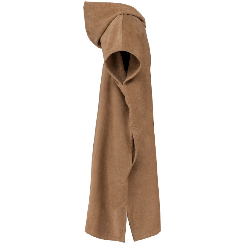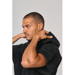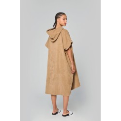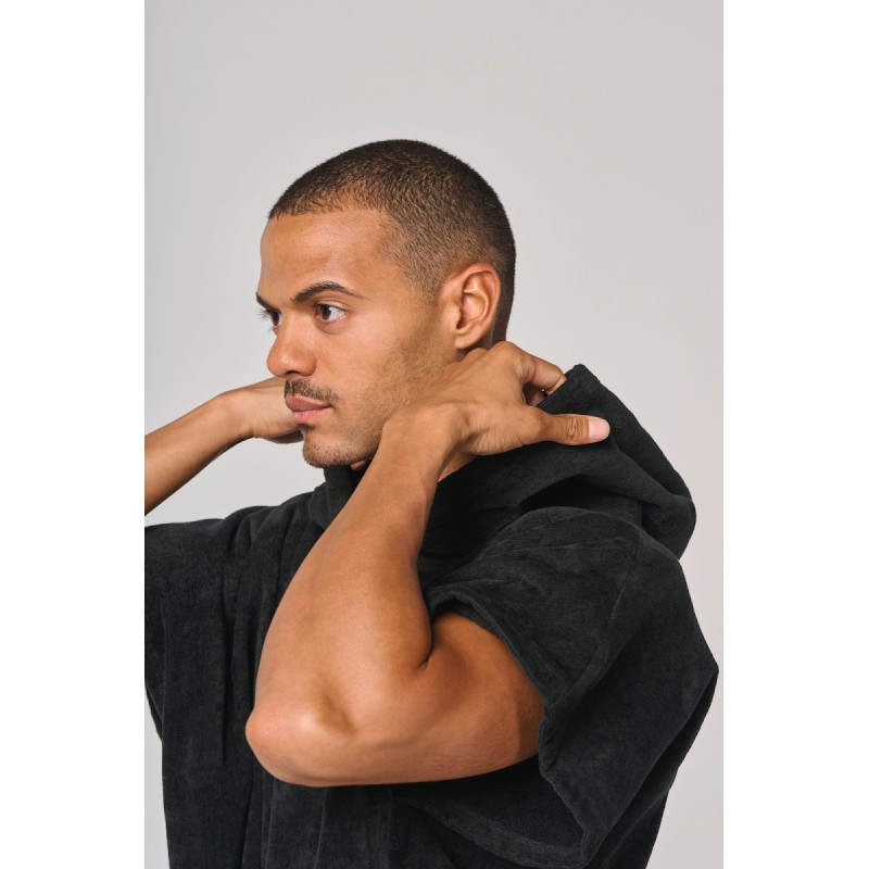 100% coton biologique. Tissu Terry. Capuche croisée devant. Grande poche centrale ouverte à l'intérieur du vêtement. 2 ouvertures latérales à mi-hauteur pour faciliter l'habillage et le déshabillage. 2 fentes latérales avec coutures de renforts. Finition demi-lune encolure au dos pour faciliter la personnalisation de marque à l'intérieur. Pas d'étiquette de marque au col, uniquement une puce de taille pour faciliter la personnalisation.