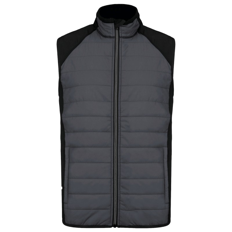Extérieur : corps 100% polyamide ripstop avec traitement déperlant, côtés et dos 90% polyester / 10% élasthanne. (Marl Grey/ Sporty Navy : 100% polyester). Garniture intérieure 100% polyester. Matière ultra confortable. 2 poches zippées devant. Fermeture zippée contrastée. Biais élastiqué aux emmanchures et au bas du vêtement. 1 zip côté cœur pour accès personnalisation.