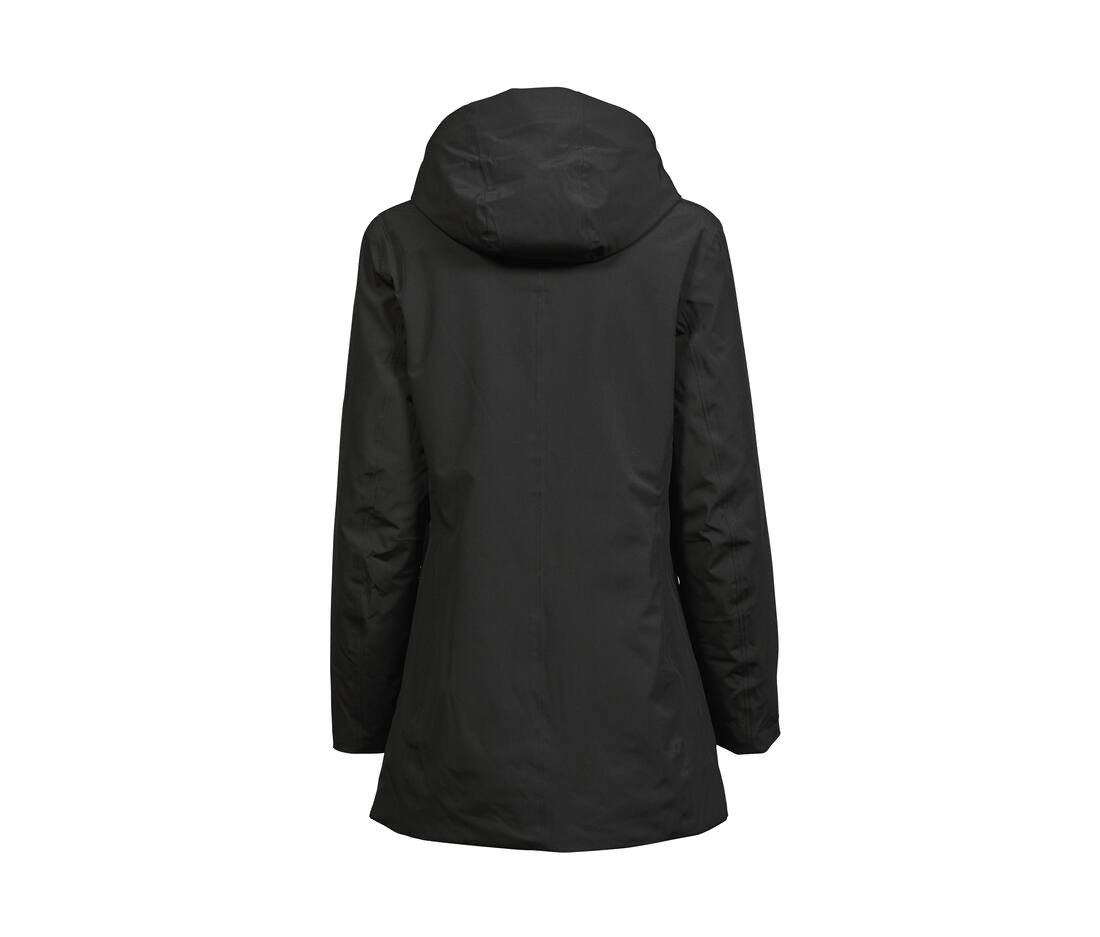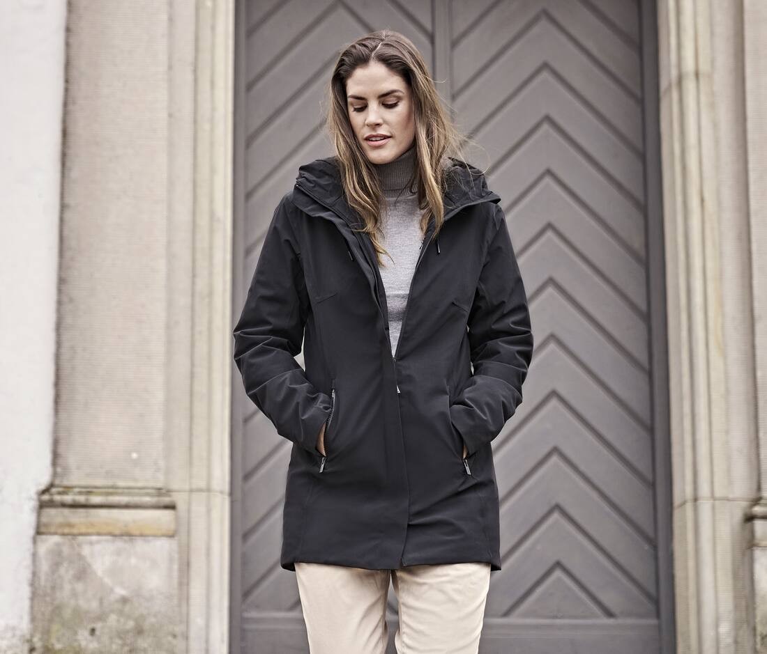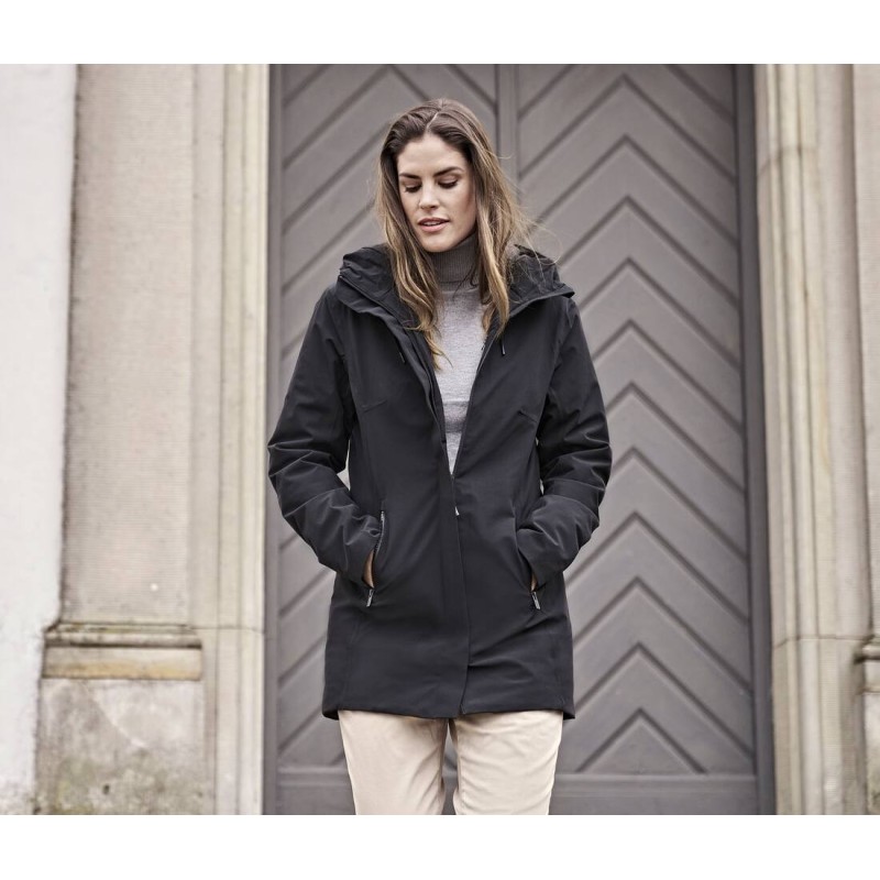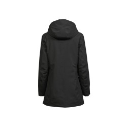Parka féminine mi-longue. Fermeture grand-zip. Moderne et sportive. Déperlante. Capuche. Poches avant matelassées et fermetures Eclair® déperlantes. Rabat tempête avec fermetures magnétiques.