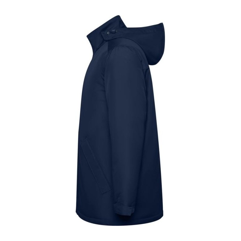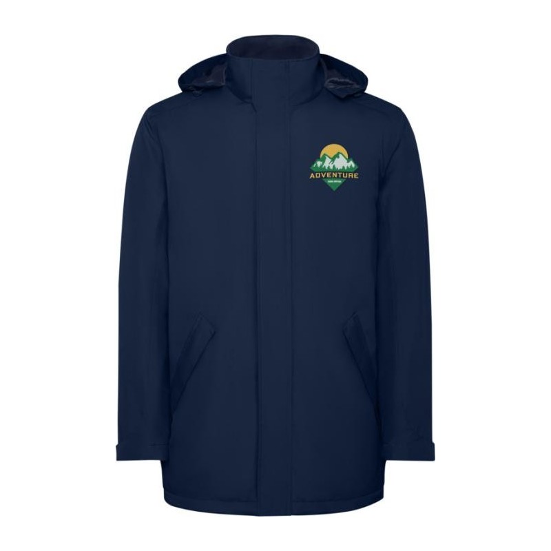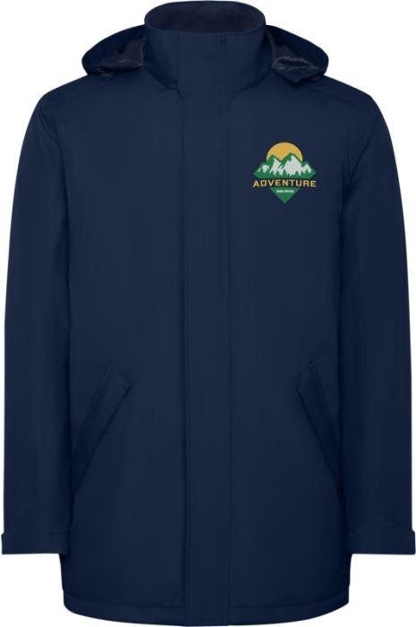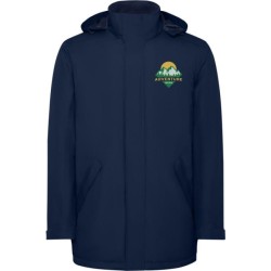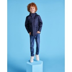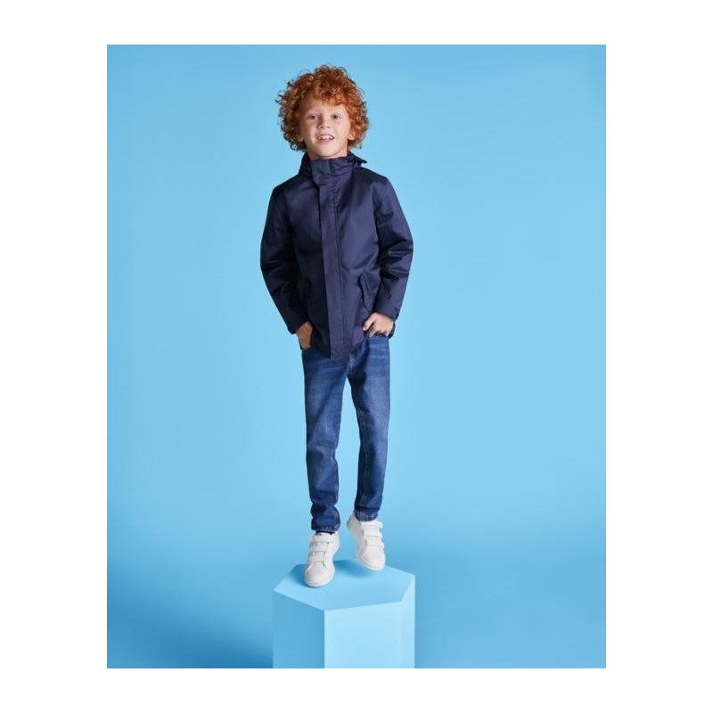 Veste parka matelassée et imperméable pour enfant. Col montant avec capuche rabattable et fermeture velcro. Fermeture à glissière centrale assortie avec rabat. Poches latérales avec fermeture à glissière et rabat fixe. Poche intérieure avec fermeture velcro. Poignets réglables avec boucle velcro. Accès intérieur aux renforts dans le dos et sur la poitrine (côté gauche).