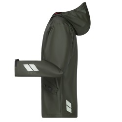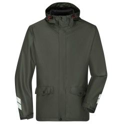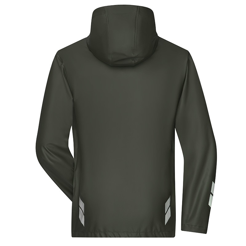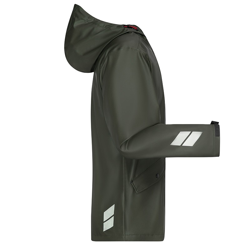 Surveste de pluie Unisexe Manches et bas réglables Col montant Large capuche ajustable pouvant accepter un casque de chantier Fermetures zippées YKK Rabat coupe-vent 2 poches latérales avec rabat Impressions réfléchissantes sur les manches et à l'arrière Coutures étanches Coupe-vent et imperméable 60% polyester 40% polyuréthane 10 000 mm de colonne d'eau Coutures étanches