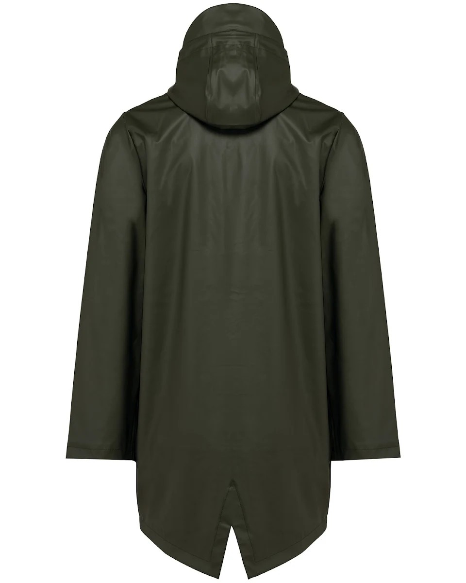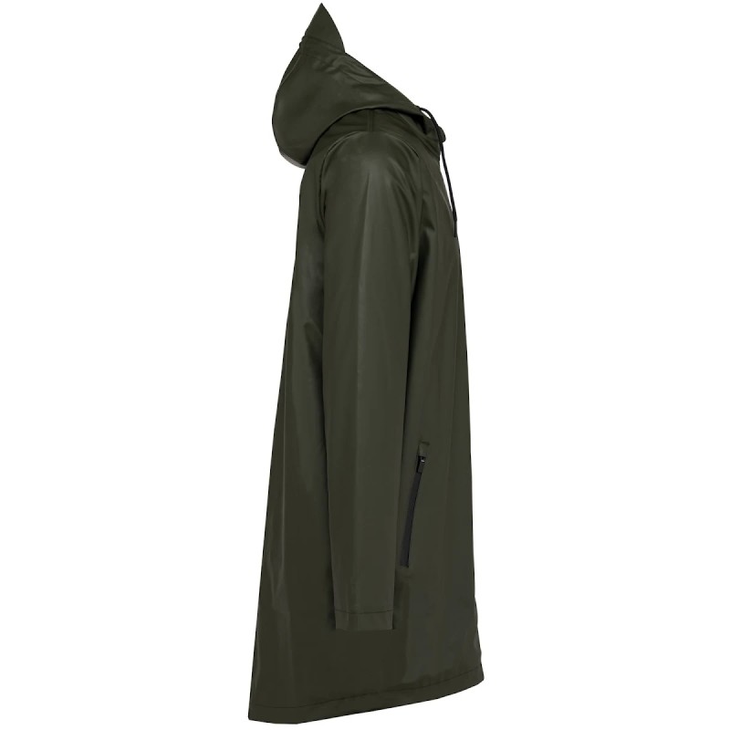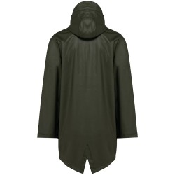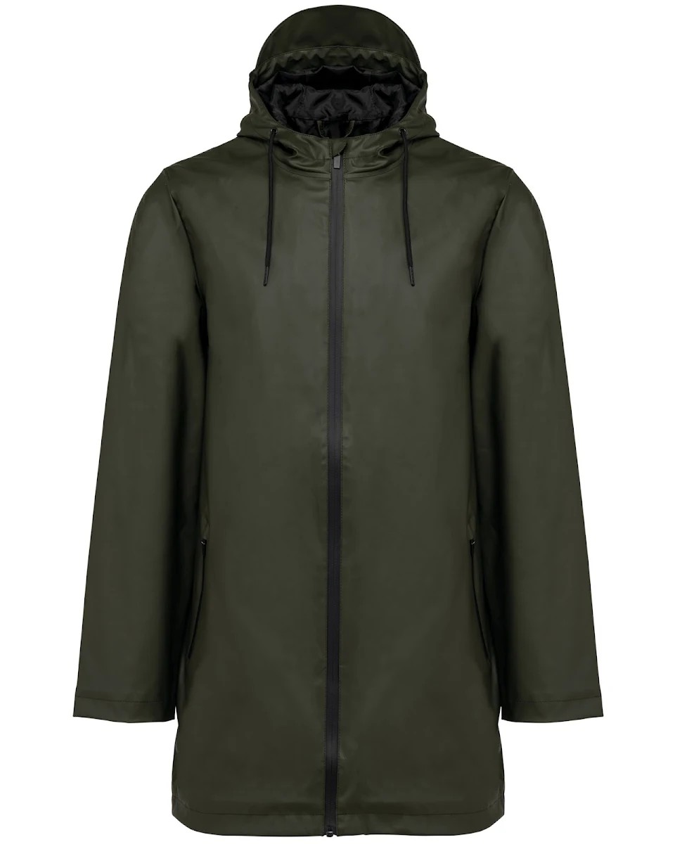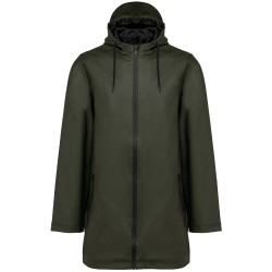 100% enduction polyuréthane couche extérieure et 100% polyester couche intérieure. Coutures thermosoudées. Imperméable 5000 mm. Doublure 100% polyester. Capuche avec visière et cordon de serrage, stopper finition métal. Fermeture zippée reverse imperméable jusqu'au col, avec cache zipper en haut. 2 poches latérales avec fermeture éclair imperméable et cache-zipper. Œillets d'aération au niveau des aisselles. Dos plus long, doté d'une fente d'aisance en bas. Loop à l'intérieur du col pour accroché la veste. Patch de personnalisation à l'intérieur sur le haut du dos. Zips de personnalisation à l'intérieur, bas du dos et côté cœur. Pas d'étiquette de marque, uniquement une puce de taille pour faciliter la personnalisation.