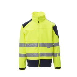 WP 8000 mm H₂O, WVT 5000 g/m² 24h. Veste pour homme, coupe ergonomique bicolore haute visibilité à bandes 3M, fermeture éclair longue SBS à ruban, poignets réglables avec serre-poignet en velcro, avec capuche escamotable, deux poches latérales avec zip, une poche poitrine, porte-badge détachable et refermable et une poche au bras gauche.