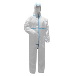 Combinaison de protection à usage unique en tissu-non-tissé blanc avec laminage externe blanc. Capuche à extrémité élasticisée, élastiques serre-poignet, passants élastiques pour pouces, serre-cheville et serre-taille. Fermeture éclair couverte par rabat adhésif, zip en plastique et tirant en métal. Coutures thermosoudées avec ruban bleu ciel en contraste. Équipement de protection individuelle de catégorie III type 4-B/5-B/6-B : protection partielle contre les produits chimiques liquides avec fermetures hermétiques étanches aux pulvérisations (Type 4), protection contre les particules solides transportées par l'air (Type 5), protection limitée contre les agents chimiques liquides (Type 6), protection contre le risque d'accumulation de charges électrostatiques, protection contre les agents infectieux (B), protection contre la contamination radioactive. Carton de 50 pièces conditionnées en sachets individuels.