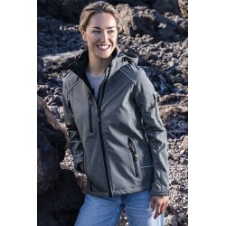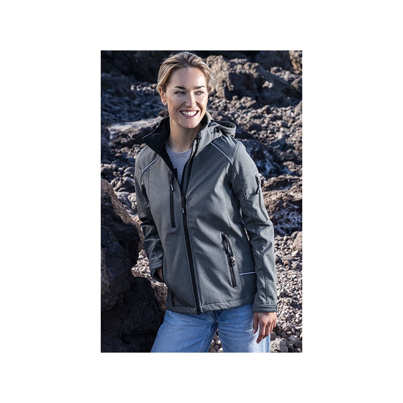 Veste Softshell femme, capuche amovible avec régulateur de volume, fermetures éclair étanches, protection menton, poche Napoléon, poche manche, poignets réglables avec fermeture velcro, cordon de serrage tunnel au bas avec stop-cordons à l'intérieur, dos plus long avec ourlet incurvé, 2 poches latérales zippées. , porte-clés cousu dans la poche latérale, passepoil réfléchissant et tirettes de zip, coutures des panneaux, étiquette de taille neutre, respirant, imperméable 8.000 mm, polaire softshell collée bi-élastique, matériau extérieur : 95 % polyester, 5 % élasthanne, matériau intérieur : 100 % polyester, 310g/m², S–XXXL Unité = 1 pièce.