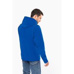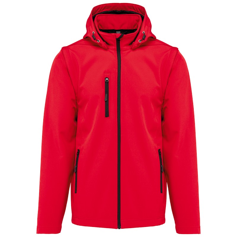 95% polyester/ 5% élasthanne. Tissu contrecollé 3 couches respirant. 3000 g/m² /24 h et imperméable 8000 mm. Extérieur : 95% polyester/ 5% élasthanne. Intermédiaire : membrane respirante. Couche intérieure : micropolaire. Tissu facilitant l'impression. Coupe ajustée. Fermeture zippée. 2 poches zippées sur le devant et une poche zippée devant côté droit au porter. Capuche amovible à l'aide de boutons pression et cordon de serrage. Manches amovibles à l'aide d'un zip. Finition double aiguille au bas de manche et de vêtement.
