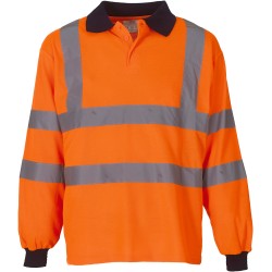 100% Polyester. Deux bandes réfléchissantes de 5 cm de largeur autour du corps et des bras et une sur chaque épaule. Col et poignets côtelés bleu marine contrastés. Patte à 3 boutons. Finition double aiguille. Hi Vis Orange et Hi Vis Yellow conforment à la norme EN ISO20471: 2013 Classe 3. Hi Vis Orange est également corforme à la norme GO / RT 3279.