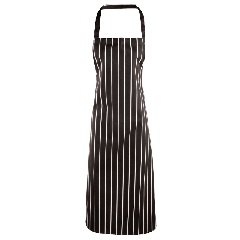 Rayures imprimées de style « boucher », bande de col dans la continuité du tissu, attaches dans la continuité du tissu de 90 cm. Largeur 72 cm, Longueur à partir de la 71 cm, Longueur totale 101 cm.