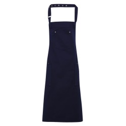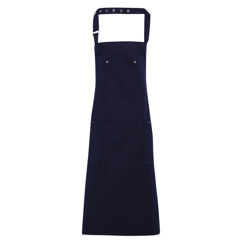 Tablier bavette aux détails reprenant le style populaire du pantalon chino. La partie supérieure est dotée en son milieu d’une poche plaquée avec des rivets et deux poches latérales assez grandes pour y insérer une tablette se situent juste en dessous de la taille. La lanière de cou s'attache en enfilant l'extrémité dans la boucle et en l'attachant grâce aux boutons pression.