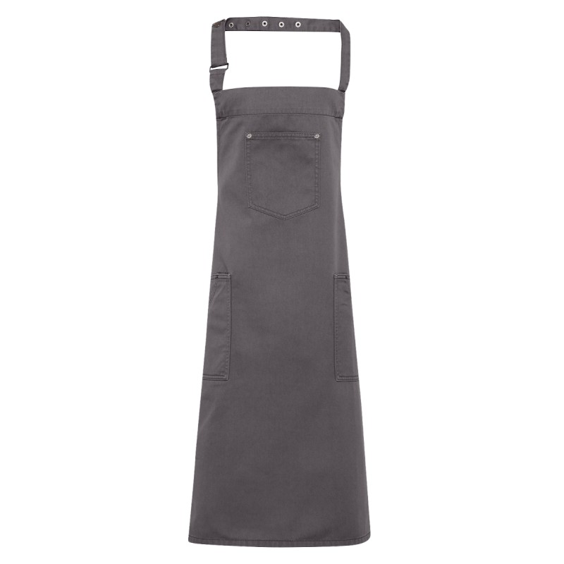 Tablier bavette aux détails reprenant le style populaire du pantalon chino. La partie supérieure est dotée en son milieu d’une poche plaquée avec des rivets et deux poches latérales assez grandes pour y insérer une tablette se situent juste en dessous de la taille. La lanière de cou s'attache en enfilant l'extrémité dans la boucle et en l'attachant grâce aux boutons pression.